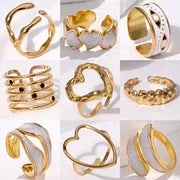 “Add a touch of timeless charm with this women’s open ring. Made from durable 304 stainless steel and finished with 18K gold vacuum plating, it features geometric, heart, and leaf patterns for a unique retro-elegant style. With an adjustable fit and lightweight design (10–13g), it’s perfect for daily wear.”